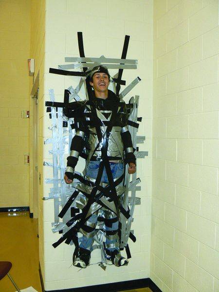 The students were allowed to create their own design for how their tape should attach to the wall and the “hanger.” Some students were attached to the wall horizontally, some vertically and some at a slightly different angle.Chloe Nelson and her group laid out an intricate grid of duct tape to the wall before they began attaching classmate David Anderson to it.”The tape doesn’t stick to the wall that well, so we’re providing a grid of tape to attach the tape to,” she explained.The team of Veronica Sanez, Vanessa Hinojos and Milton Arroyo created a harness made of duct tape and attached the harness and Veronica to the wall.”It’s kind of like Spider-Man,” they enthused.