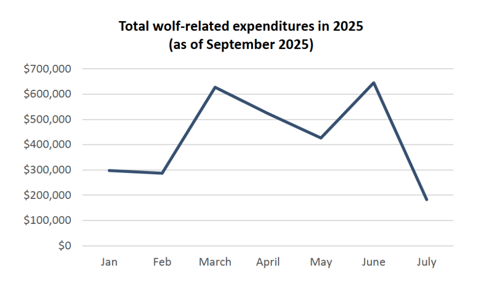 In addition to the $2.1 million, the state legislature established a separate fund to compensate producers for wolf-related losses to livestock and livestock guardian animals. The wolf depredation fund received $175,000 from the general fund in the 2023-24 fiscal year, but has received $350,000 in each subsequent year.