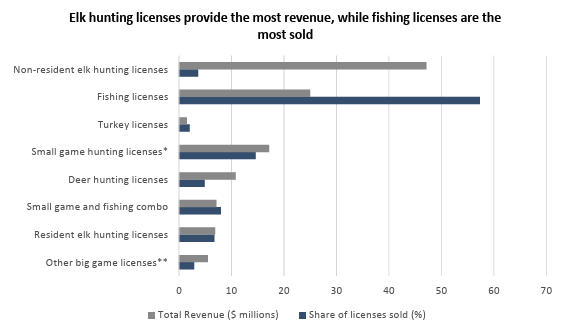 In the most recent fiscal year, non-resident elk licenses provided the most revenue to the wildlife agency’s Wildlife Cash Fund — bringing in around $45 million, despite representing less than 5% of total licenses sold. A non-resident elk adult hunting license was $825.03 in the most recent hunting season, compared to $67.86 for an adult Colorado resident. According to the joint budget committee report, resident elk hunting licenses brought in over $5 million in the latest fiscal year and represented just over 5% of the agency’s license sales.