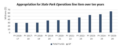 After wildlife operations, state park operations are the second-largest line item in the Department’s budget, with a $64.8 million appropriation in the 2025-26 fiscal year and around 332 full-time staff positions. While most expenditures are for staffing costs, Shen noted that “operating expenses are smaller but still a large part of spending” for Colorado’s state parks.