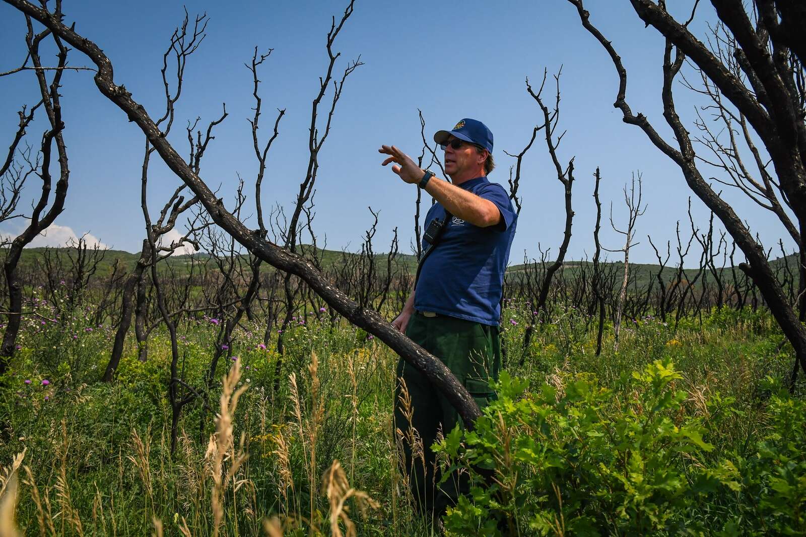 “This is exactly what we’re looking for,” Oliver said, pointing out a vibrant undergrowth on the burn scar. “These Gambel oak trees are perfectly designed for wildfires. So long as their roots aren’t scorched, they come back in a matter of years.”