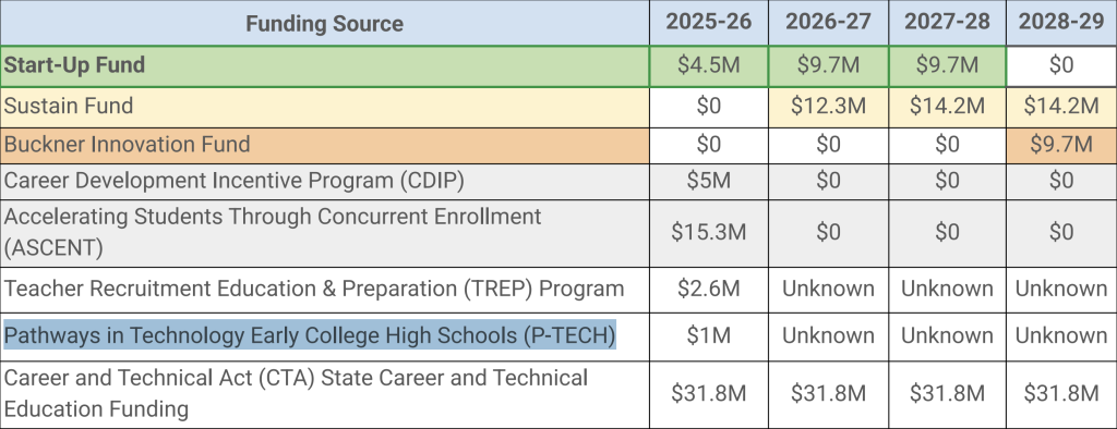 Other state programs also exist to fund postsecondary workforce readiness program in 2025-26, such as the Career Development Incentive Program, Accelerating Students Through Concurrent Enrollment (ASCENT), the Teacher Recruitment Education & Preparation Program and the Pathways in Technology Early College High Schools, though some won’t provide funding past 2026.