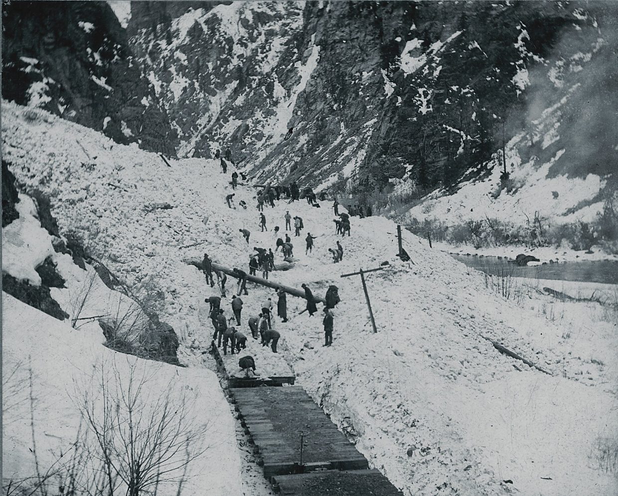 A crew of 50 men worked to uncover the wrecking train from the small slide when at 12:40 in the afternoon a second avalanche of enormous proportions roared down the canyon slopes, striking the crew, burying many, and sweeping three into the Colorado River. A tool car, caboose and a 56-ton engine were pushed to the banks of the river. The tracks were now covered with an additional 20 feet of snow.
